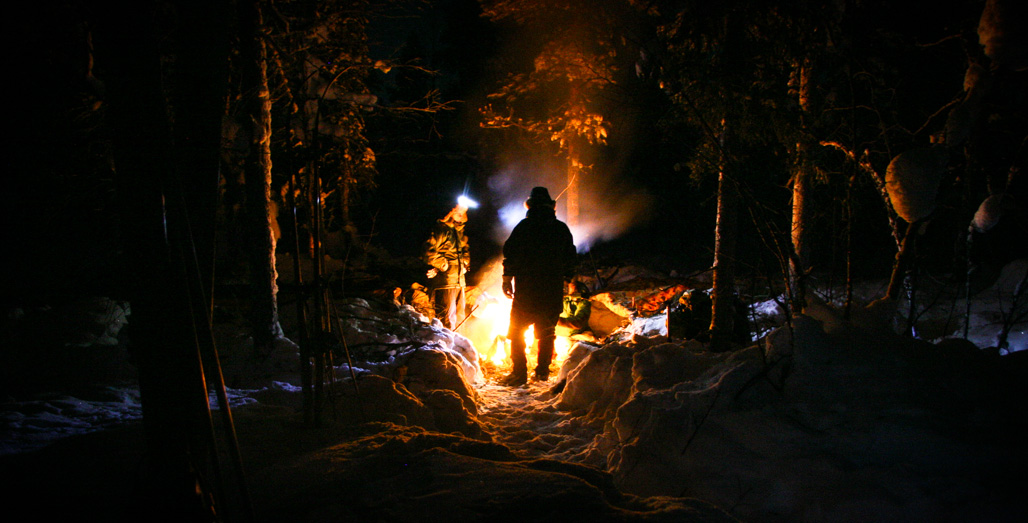 Brittien saama ohjeistus makuupaikan eristämiseen oli nimittäin hyvä. Lumi kaivettiin pois, maahan asetettiin kosteudelta suojaava pressu. Sen päälle he asettelivat paksun kerroksen havuja ja sitten oman maakuualustansa. Jotkut hakivat vielä porontaljan lisäeristeeksi perusleiristä. Altapäin tuleva kylmyys ei varmasti yötä pilannut vaan joku muu.